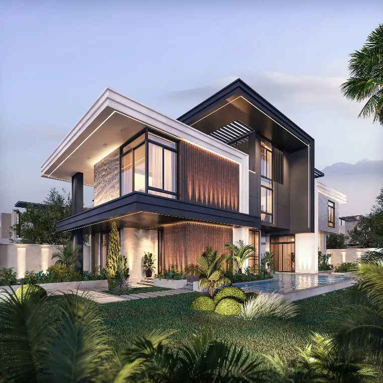 As the sun sets, the villa transforms into a spectacle of light and shadow, thanks to innovative lighting solutions meticulously integrated into the exterior design. Architectural lighting highlights key features of the facade, while strategically placed fixtures illuminate pathways and outdoor living spaces, creating an enchanting ambiance after dark.